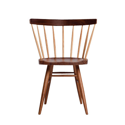 The Nakashima Straight Chair is constructed from solid American Walnut, turned American Walnut legs and stretchers, and contrasting Hickory spindles, clear low-sheen finish and nylon glides.